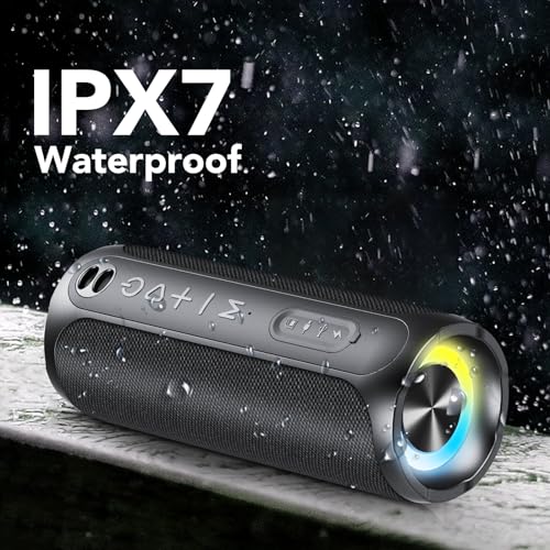 Astonishing Stereo Sound: Equipped with TWS technology, it connects two 10W drivers to deliver true stereo surround sound with deep bass, ensuring crystal-clear audio without distortion. Four Play Modes: Adapt to any situation with Bluetooth, TF card, AUX input, and USB modes. Perfect for home, parties, travel, or outdoor activities. IPX7 Waterproof: The IPX7 rated enclosure and silicone port covers offer robust waterproof protection, making it resistant to rain splashes. 24H Battery Life: A 2600mAh Li-Ion battery provides up to 24 hours of continuous playback. Recharge fully in just 3 hours with an easy-to-monitor low battery indicator. RGB Colored Lights: Enhance your experience with five different theme colors. Adjust the lights to match the party atmosphere or turn them off as needed. Bluetooth 5.3 and One-Step Auto Pairing: Benefit from faster pairing, stable connections, and a greater wireless range of up to 50 feet with the advanced Bluetooth 5.3 chip.